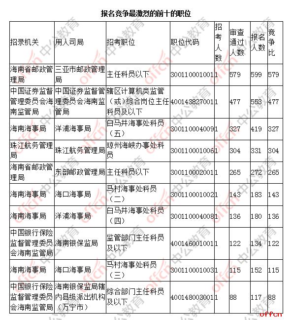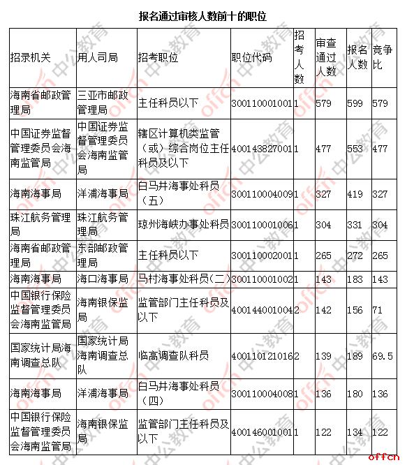 報名通過審核人數(shù)前十的職位主要集中在海南省郵政管理局、中國證券監(jiān)督管理委員會海南監(jiān)管局、海南海事局等部門,具體信息如下: