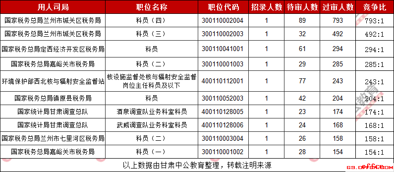 截至10月30日9時,競爭比例最高的職位是國家稅務(wù)總局蘭州市城關(guān)區(qū)稅務(wù)局科員(四),招錄1人,過審人數(shù)為793人,競爭比793:1!具體信息如下: