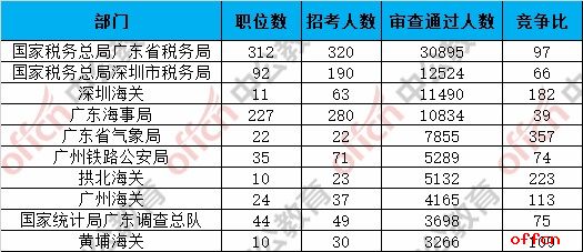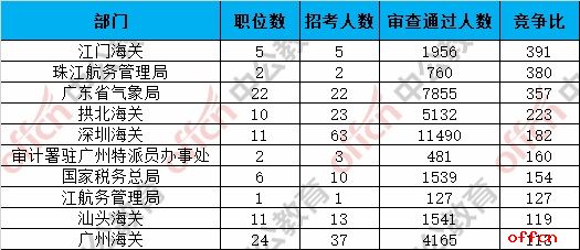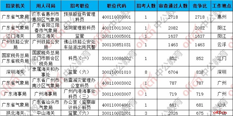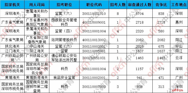報(bào)名通過審核人數(shù)前十的職位主要集中在深圳海關(guān)、廣東省氣象局、拱北海關(guān),具體信息如下: