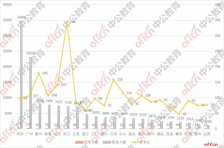 截止到30日16時(shí),競爭比例最高的廣東地區(qū)為陽江,招錄21人,截止到30日16時(shí)報(bào)名人數(shù)為7226人,競爭比344:1。