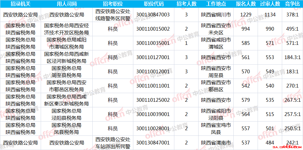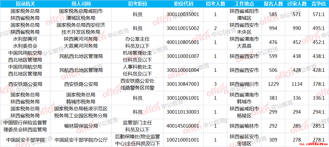 報名人數(shù)較多的前十職位主要集中在西安鐵路公安局、國家稅務總局陜西省稅務局、中國民用航空局西北地區(qū)管理局等部門,具體信息如下: