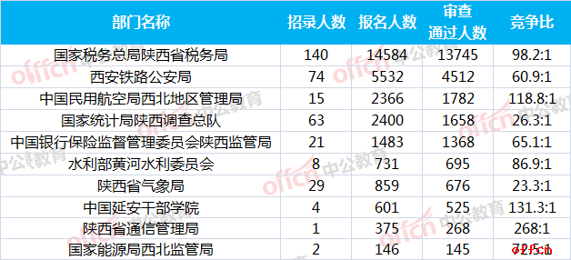 為幫助廣大考生更清晰的了解今日報名情況,整理了審核通過人數(shù)前十位的部門以及競爭比例最激烈的前十部門,供廣大考生參考: