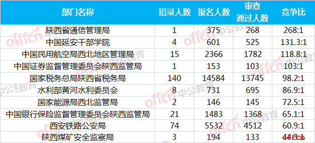 從競爭比來講,目前競爭比最高的部門為陜西省通信管理局,達到268人競爭1個職位,競爭比為268:1,去年此時,競爭比最高的部門為陜西省郵政管理局,競爭比為174.8:1。