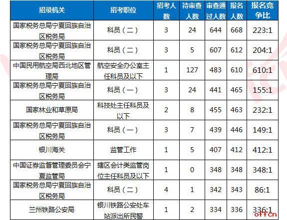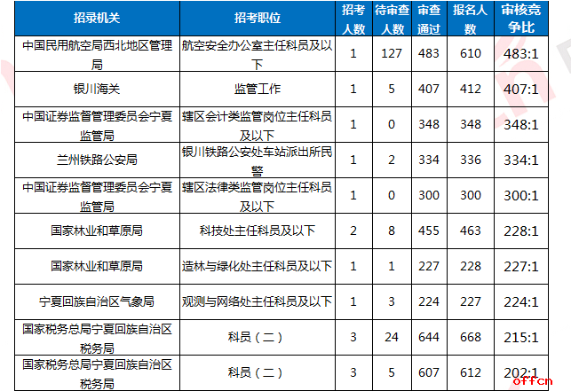 截至10月31日17時30分,職位競爭比排名前十的招錄機關(guān)主要集中在中國民用航空局西北地區(qū)管理局、銀川海關(guān)、中國證券監(jiān)督管理委員會寧夏監(jiān)管局,其中目前最高競爭比已經(jīng)達到483:1