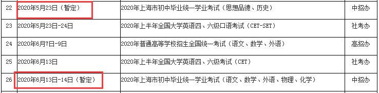 《2020年度上海市教育考試院各類考試信息一覽表》了解到,2020年上海中考時間已公布,上海中考具體時間安排在2020年6月13日-14日期間舉行,具體如下: