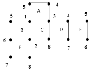 由左圖可知,點(diǎn)1為已經(jīng)確定的公共點(diǎn),即連接著A、B、C三個(gè)面,同理點(diǎn)2和點(diǎn)3也為確定的公共點(diǎn)。所以,從確定的公共點(diǎn)出發(fā),沿著展開圖的外圍,距離點(diǎn)3為1的點(diǎn)為公共點(diǎn),可找出兩個(gè)點(diǎn)4,連接著A、D、E三個(gè)面,可確定。繼續(xù)從已確定的公共點(diǎn)4出發(fā),沿著展開圖的外圍走距離1,可確定兩個(gè)點(diǎn)5,連接著A、E兩個(gè)面,又因?yàn)辄c(diǎn)1往上1的距離為點(diǎn)5,所以點(diǎn)1往左1的距離也為點(diǎn)5,即點(diǎn)5連著的第三個(gè)面為B。繼續(xù)從已確定的公共點(diǎn)5出發(fā),距離點(diǎn)5距離為1的點(diǎn)為下一個(gè)公共點(diǎn),即點(diǎn)6,連著B、F、E三個(gè)面,可確定。從已確定的公共點(diǎn)6出發(fā),距離點(diǎn)6距離為1的點(diǎn)為公共點(diǎn)7,連著D、E、F三個(gè)面,可確定。繼續(xù)從已確定的公共點(diǎn)7出發(fā),距離點(diǎn)7距離為1的公共點(diǎn)為下一公共點(diǎn),即點(diǎn)8連著C、D、F三個(gè)面,可確定。