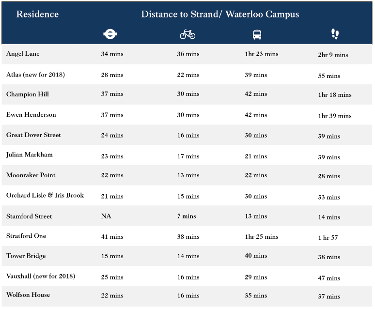 舉例來說,下圖所示是倫敦國王學(xué)院提供的學(xué)生住宿,及每個(gè)宿舍與Strand校區(qū)之間各交通方式所用時(shí)間。而每個(gè)宿舍又有不同的房型和合同期選擇。其中,Wolfson宿舍提供公用衛(wèi)生間的宿舍間和獨(dú)立公寓兩種選擇。宿舍間又分為40周合約和48周合約兩種,每周住宿費(fèi)用則分別為155英鎊和150英鎊。而獨(dú)立公寓一周的費(fèi)用則高達(dá)399英鎊。