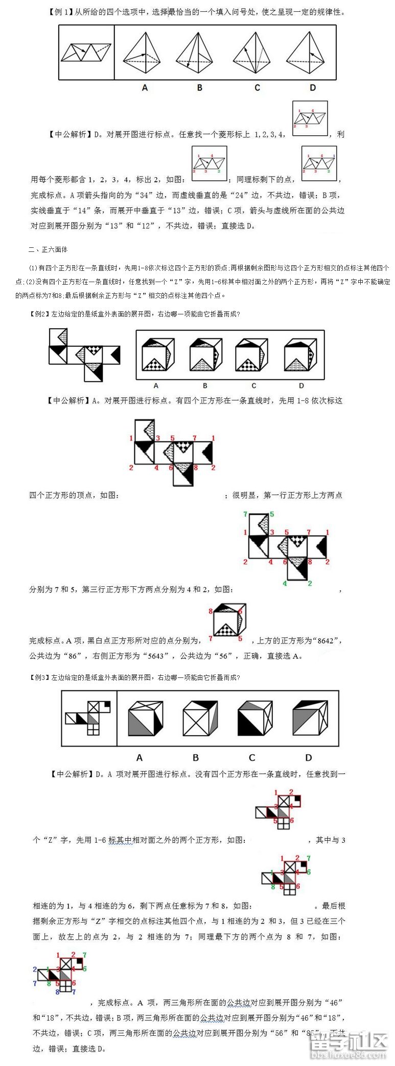 行測圖形推理作為一種思維能力測試的題型,其中最讓廣大考生頭疼的則是立體圖形。有一種神奇的方法——“公共點(diǎn)法”,能夠幫助廣大考生解決立體圖形折紙盒類問題,如正四面體和正六面體等。當(dāng)然,也有不少考生反映說,“公共點(diǎn)法”的按單位“1”的距離找公共點(diǎn)標(biāo)起來太費(fèi)時(shí)間,問有沒有更快的標(biāo)點(diǎn)方法。為此,小編分別對正四面體及正六面體的標(biāo)點(diǎn)進(jìn)行了優(yōu)化,具體如下: