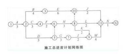 施工總承包單位提交的施工總進(jìn)度計(jì)劃的工期是18個(gè)月(1分)。該工程總進(jìn)度計(jì)劃的關(guān)鍵線路為①→②→④→⑥→⑧→⑨→⑾→⑿(2分)。