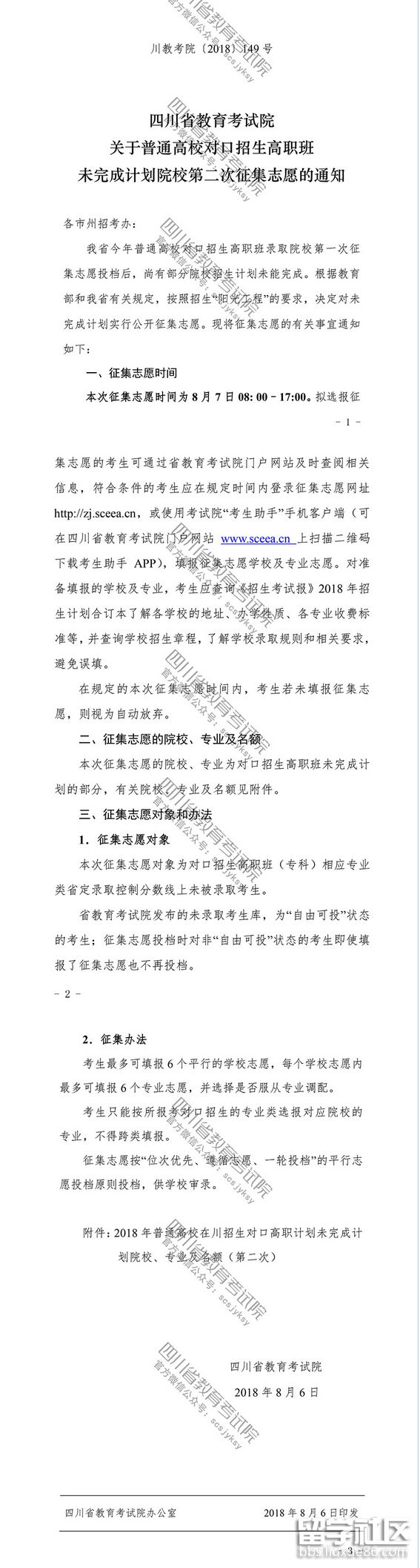 四川2018普通高校對(duì)口招生高職班未完成院校第二次征集志愿通知