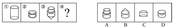 4. [解析] D.觀察題目發(fā)現(xiàn):①應(yīng)當(dāng)由②③④圖形共同組成,因此問號(hào)處的圖形應(yīng)為一-個(gè)圓柱的內(nèi)部截掉一個(gè)圓錐,D項(xiàng)符合。
