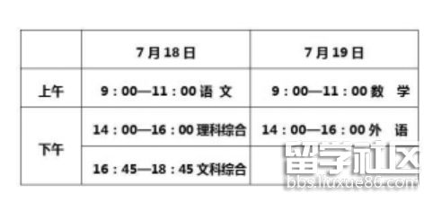 7月18日:9:00——11:00,語文;14:00——16:00,理科綜合;16:45——18:45,文科綜合;7月19日:9:00——11:00,數(shù)學(xué);14:00——16:00,外語。