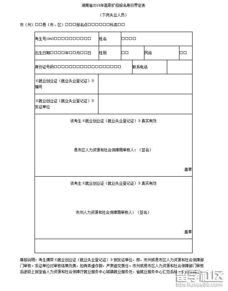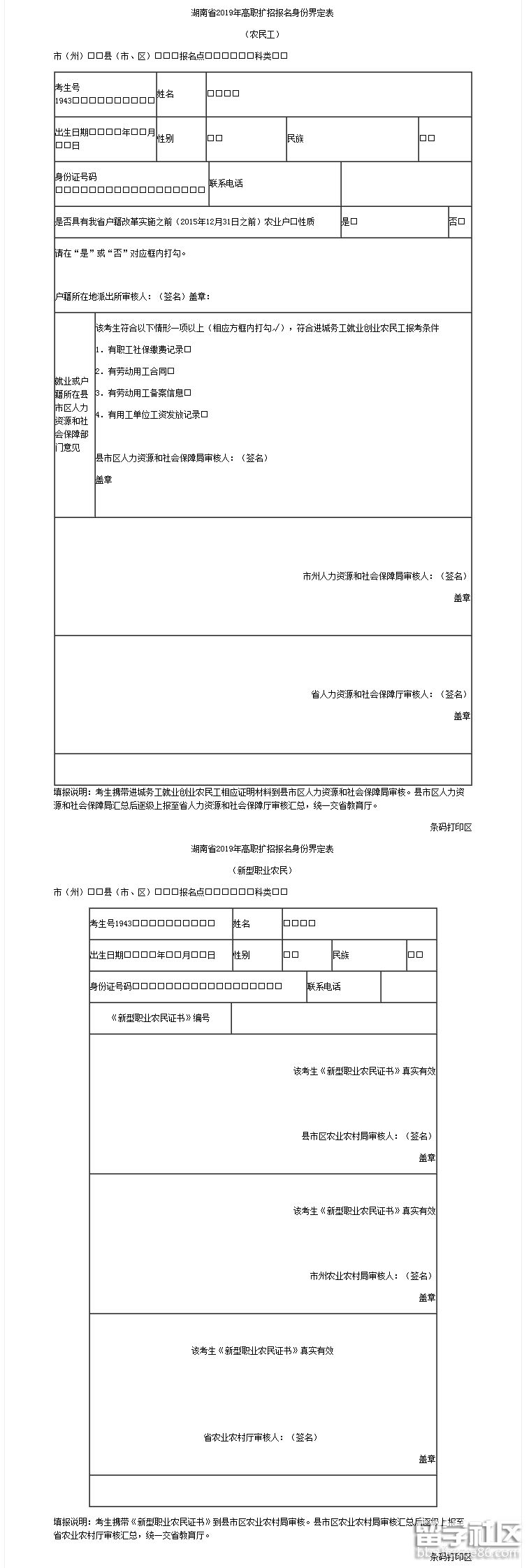 (四)退役軍人和下崗失業(yè)人員、農(nóng)民工、新型職業(yè)農(nóng)民報名完成后,須下載打印相應(yīng)類別的《湖南省2019年高職擴招報名身份審核表》(附件2,以下簡稱身份審核表),按照要求填寫后于7月10日前交相關(guān)部門統(tǒng)一辦理有關(guān)資格審核和身份界定手續(xù),具體流程與要求見相關(guān)表格中的說明。