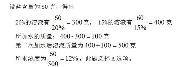 2、某鹽溶液的濃度為 20%,加入水后溶液的濃度變?yōu)?15%。如果再加入同樣多的水,則溶液的濃度變?yōu)椋?)。