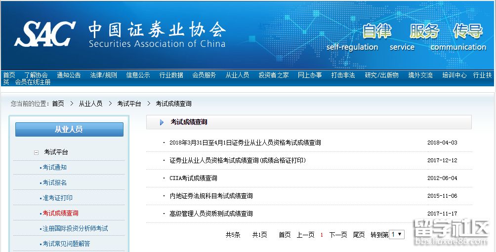 2、證券從業(yè)資格考試成績查詢查詢途徑:中國證券業(yè)協(xié)會網(wǎng)站-從業(yè)人員-考試平臺-考試成績查詢-當次考試成績查詢。