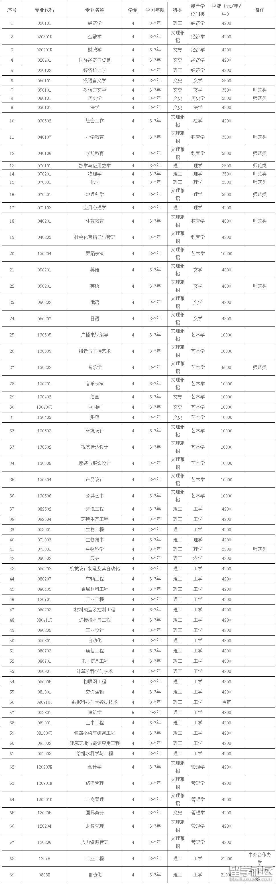 經濟學、國際經濟與貿易、財政學、金融學、法學、學前教育、小學教育、漢語言文學、英語、俄語、日語、音樂學、雕塑、繪畫、中國畫、環(huán)境設計、產品設計、視覺傳達設計、服裝與服飾設計、公共藝術、舞蹈表演、音樂表演、廣播電視編導、播音與主持藝術、社會體育指導與管理、體育教育、歷史學、數學與應用數學、物理學、化學、生物科學、生物技術、地理科學、應用心理學、經濟統(tǒng)計學、金屬材料工程、焊接技術與工程、機械設計制造及其自動化、材料成型及控制工程、車輛工程、自動化、電子信息工程、通信工程、計算機科學與技術、建筑學、土木工程、建筑環(huán)境與能源應用工程、給排水科學與工程、環(huán)境工程、生物工程、園林、工業(yè)工程、工業(yè)設計、交通運輸、道路橋梁與渡河工程、工商管理、會計學、財務管理、人力資源管理、旅游管理、社會工作、物聯(lián)網工程、國際商務、環(huán)境生態(tài)工程、數據科學與大數據技術、工業(yè)工程(中外合作辦學項目)、自動化(中外合作辦學項目)。