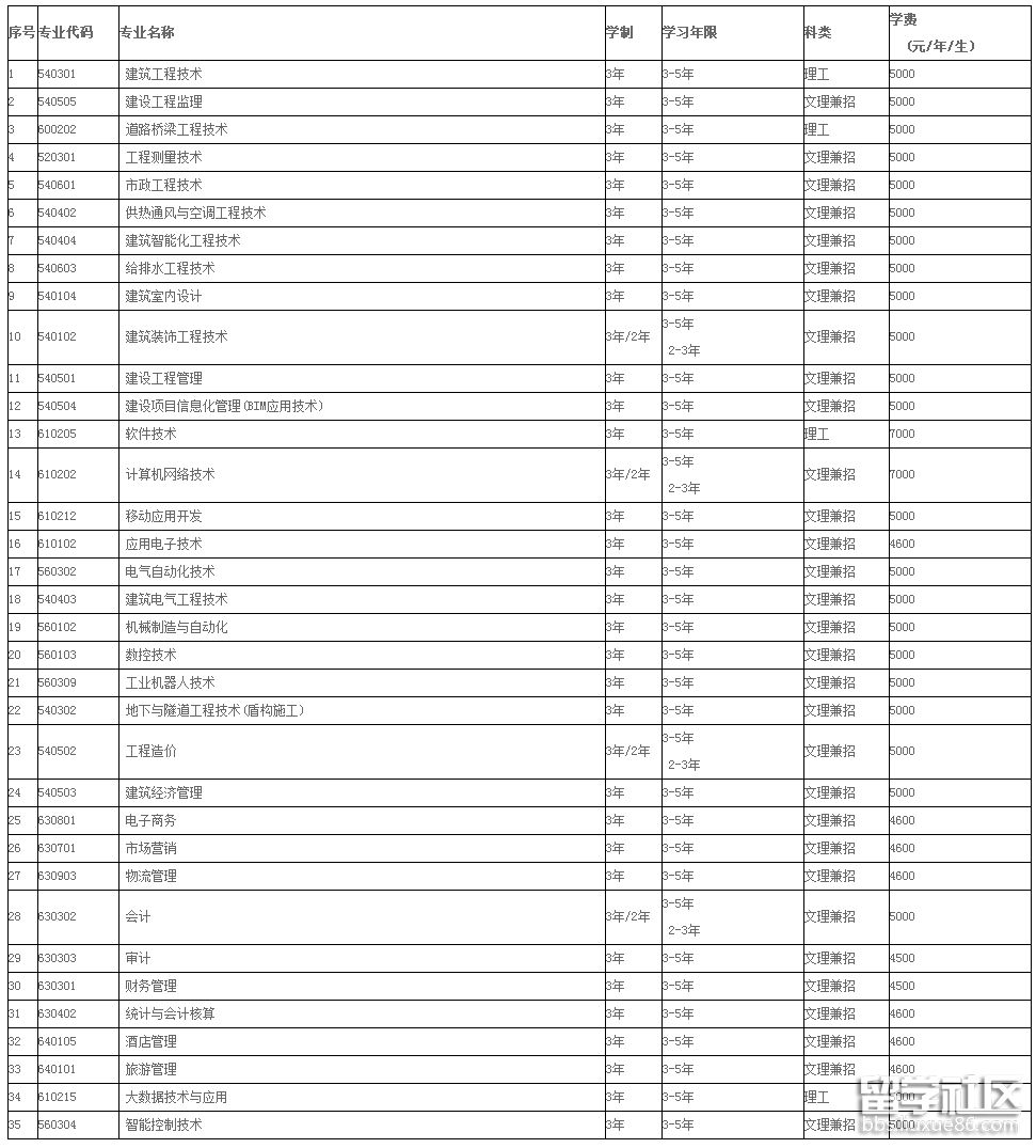 建筑工程技術(shù)、建設(shè)工程監(jiān)理、道路橋梁工程技術(shù)、工程測量技術(shù)、市政工程技術(shù)、供熱通風(fēng)與空調(diào)工程技術(shù)、建筑智能化工程技術(shù)、建筑電氣工程技術(shù)、給排水工程技術(shù)、建筑裝飾工程技術(shù)、建筑室內(nèi)設(shè)計、建設(shè)工程管理、建設(shè)項目信息化管理(BIM應(yīng)用技術(shù))、工程造價、建筑經(jīng)濟管理。