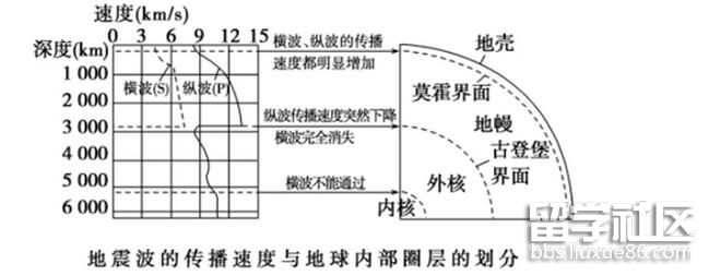 內(nèi)部圈層主要依靠地震進(jìn)行探測(cè),主要原理是地震波在通過(guò)不同介質(zhì)時(shí),傳播速度會(huì)發(fā)生改變,因此根據(jù)地震波在傳播過(guò)程中速度的變化經(jīng)過(guò)的物質(zhì)不同進(jìn)行劃分。