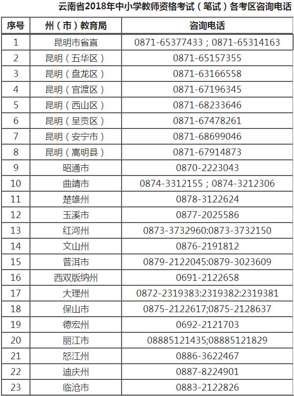 云南省 2018 年中小學(xué)教師資格考試(筆試)各考區(qū)咨詢電話