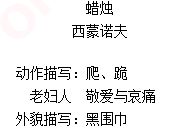 本文燭光(6次)的象征意義: 第28段交代了蠟燭的來(lái)歷,說(shuō)明了這支蠟燭有著非同尋常的意義。它雖然渺小,但卻是老婦人的寶物,老人把它最珍貴的寶物奉獻(xiàn)給了烈士,也反映了老人對(duì)紅軍戰(zhàn)士的愛(ài)戴與敬意。