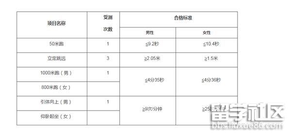 以上4個項目須全部進(jìn)行測評。其中,有3個及以上達(dá)標(biāo)的,體能測評結(jié)論為合格。體能測評實行全程錄像。