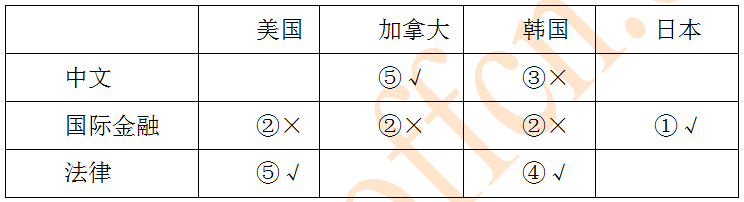 根據(jù)條件(1),日本和國際金融相交表格打鉤;國際金融行另外三個(gè)格為叉;