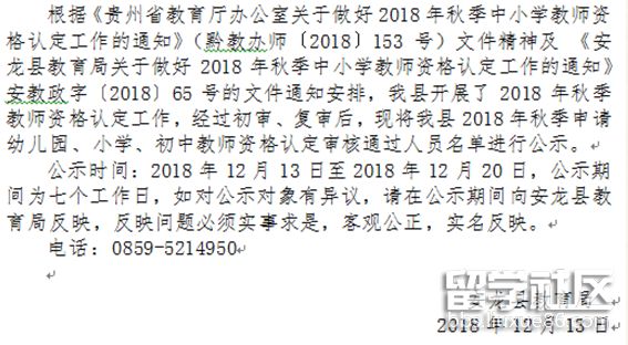 貴州安龍縣2018秋季中小學(xué)(幼兒園)教師資格證認(rèn)定結(jié)果