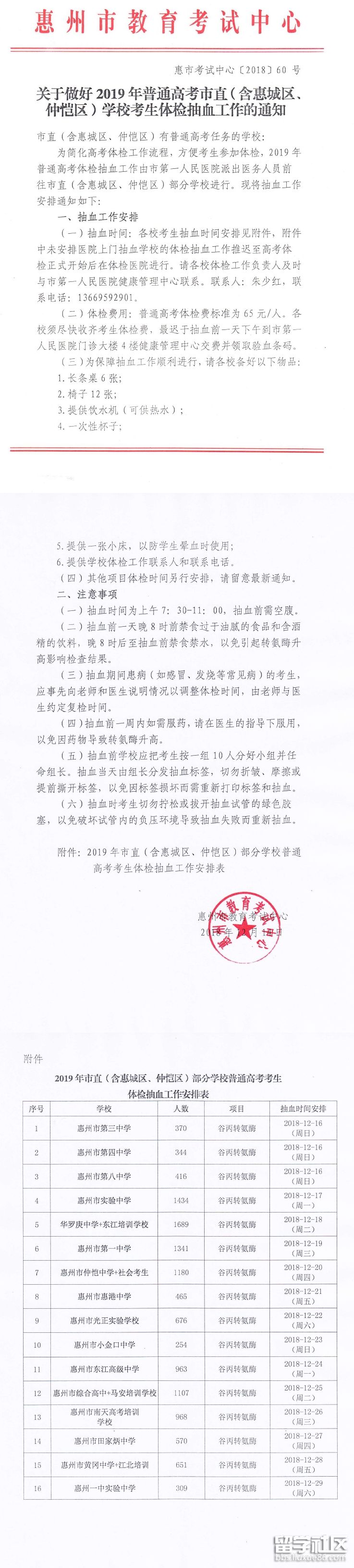 關(guān)于做好2019高考惠州市直(含惠城區(qū)、仲愷區(qū))考生體檢抽血工作的通知