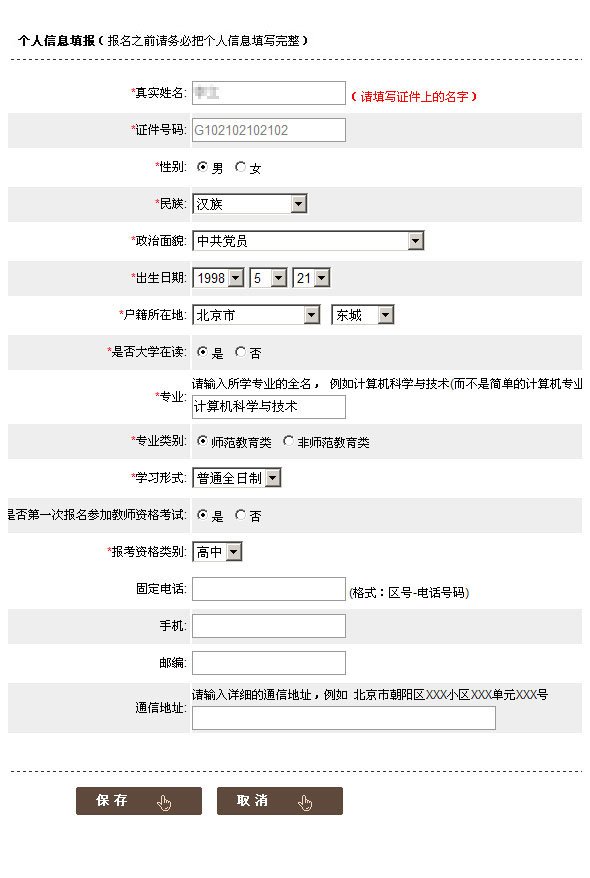 填寫必填項(xiàng)目后點(diǎn)擊“保存”。填報(bào)個(gè)人信息,包括個(gè)人姓名、證件號(hào)碼、性別、名族、政治面貌、出生日期、戶籍所在地、報(bào)考類別、學(xué)習(xí)形式、是否師范生、學(xué)校名稱、是否大學(xué)在讀、院系班級(jí)、最高學(xué)歷、最高學(xué)位、電子郵箱、手機(jī)等信息。 [報(bào)名信息有誤怎么辦?]