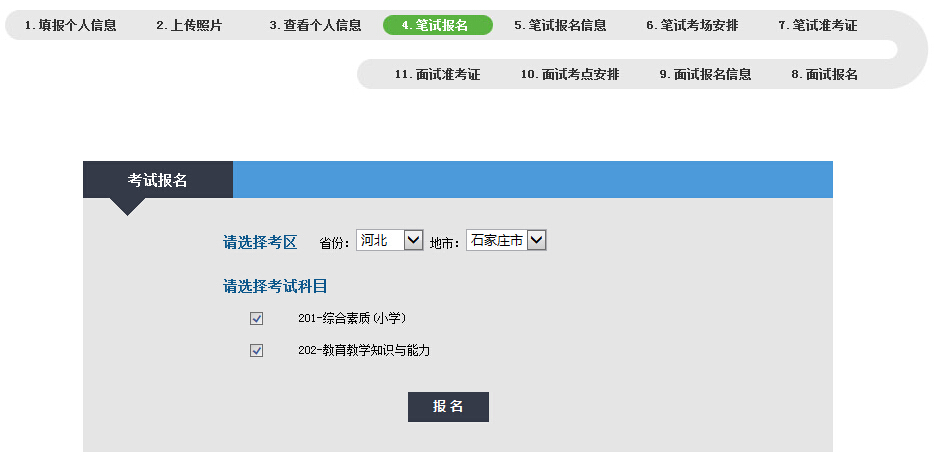 點(diǎn)擊流程中的“筆試報(bào)名”,選擇考試類別,點(diǎn)擊“下一步”。