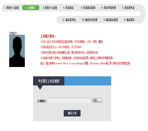 點(diǎn)擊流程中的“上傳照片”,按照照片要求上傳個(gè)人電子證件照,點(diǎn)擊“確定上傳”??忌蟼鞯恼掌瑢⒋蛴≡诳忌鷾?zhǔn)考證和考場(chǎng)簽到表上,并將在本網(wǎng)站保存以供使用成績(jī)的高校核查。如使用不合格的照片,將無法通過資質(zhì)初審。因此,建議考生到專業(yè)照相館拍攝下述規(guī)格、尺寸的電子照片。以免由于照片問題,為您帶來不必要的麻煩,請(qǐng)仔細(xì)閱讀電子版照片要求。[報(bào)名上傳照片提示]