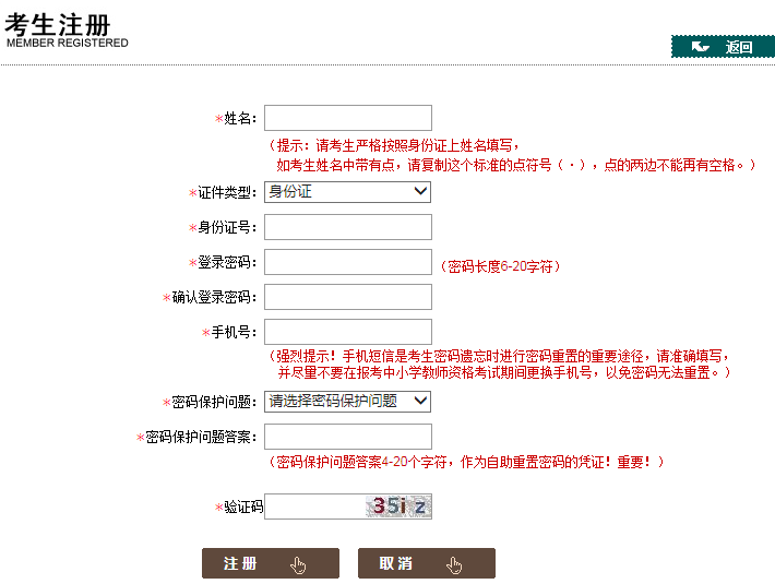 考生填寫基本信息和設(shè)置登陸密碼及密保,輸入驗(yàn)證碼后點(diǎn)擊“注冊(cè)”即可。