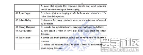 解析:根據(jù)Adam Bailey定位到文章第七段和第八段,其中第八段提到:Asking them questions about what they like about the backyard of a potential home — or asking them where their toys would go in the house — will make them feel like they’re being included in the decision-making process, Bailey said. 其中, feel like they’re being included in the decision-making process恰好與G選項a sense of involvement in homebuying decisions形成同義替換,故G為正確答案