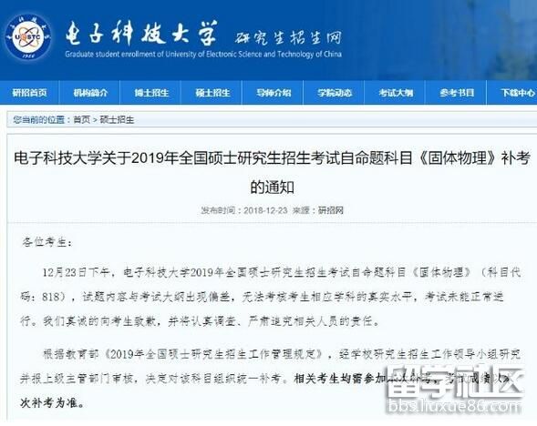 電子科技大學(xué)研究生招生網(wǎng)于12月23日發(fā)布補考通知,稱“試題內(nèi)容與考試大綱出現(xiàn)偏差,無法考核考生相應(yīng)學(xué)科的真實水平,考試未能正常進(jìn)行。我們真誠的向考生致歉,并將認(rèn)真調(diào)查、嚴(yán)肅追究相關(guān)人員的責(zé)任?!?BR> 通知中還明確,相關(guān)考生均需參加此次補考,考試成績以補考為準(zhǔn)。補考時間為2019年1月6日上午,補考地點為電子科技大學(xué)清水河校區(qū),考生參加補考產(chǎn)生的交通費及住宿費按相關(guān)標(biāo)準(zhǔn)由學(xué)校統(tǒng)一報銷。
