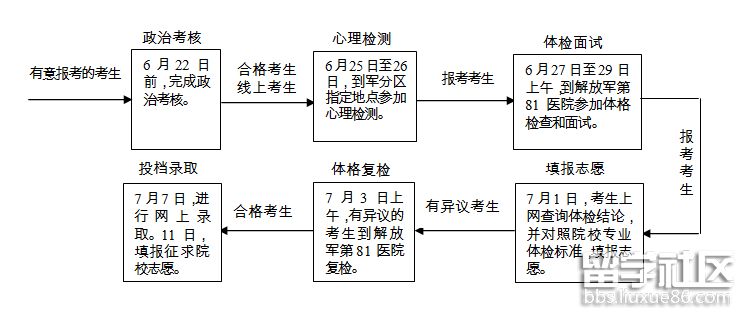 第二步 心理檢測。6月25日至26日,各軍分區(qū)(警備區(qū))集中組織,考生持本人身份證、高考《準(zhǔn)考證》、高考成績單和1張1寸近期彩色免冠照片,自行到各市檢測點報到。心理檢測合格的考生由軍分區(qū)(警備區(qū))出具面試體檢表,憑表格參加體格檢查和面試。28日17時前,將政治審查、心理檢測數(shù)據(jù)報省軍區(qū)。
