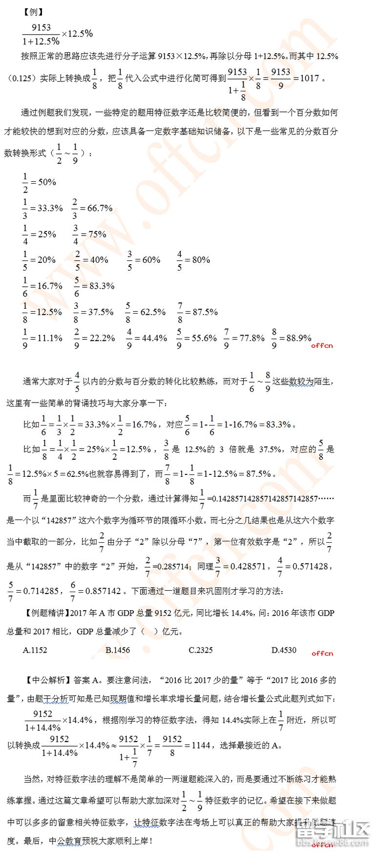 行測資料分析中的特征數(shù)字法就是將一些特定的百分?jǐn)?shù)轉(zhuǎn)化成分?jǐn)?shù),簡便運(yùn)算的一種計(jì)算方法。