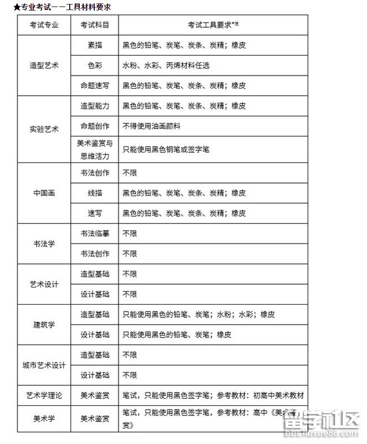 *注:專業(yè)考試可以使用定畫液。上述表格中各專業(yè)有限定工具材料的,一律按要求使用,若考生在考試中有違反情況,閱卷時(shí)按違規(guī)處理。