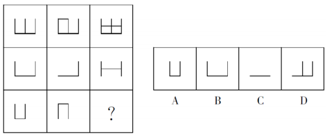 【答案】D。從圖形整體上看,圖形間有一定相似度,且元素有增減變化,可從組合疊加考慮。列間相似度更多。每列后兩個圖形直接疊加形成第一個圖形。故答案選D。