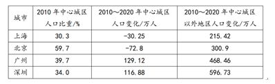 中心城區(qū)通常為城市中人口最密集的區(qū)域。表1數(shù)據(jù)顯示上海、北京、廣州、深圳四城市2010年中心城區(qū)人口比重及2010~2020年中心城區(qū)和中心城區(qū)以外地區(qū)人口數(shù)量的變化。據(jù)此完成1~3題。