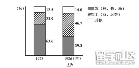 圖5是1978年與1986年北京郊區(qū)男戶主職業(yè)占比變化情況。這一變化的產(chǎn)生主要是由于( )