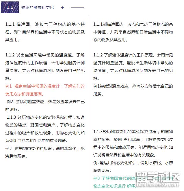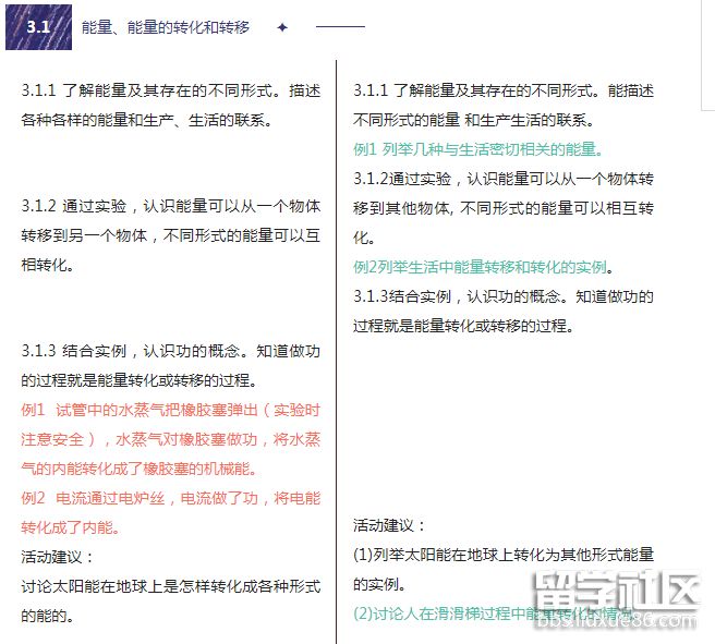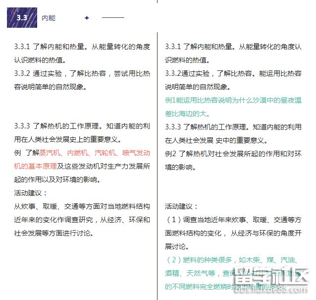 在內(nèi)容標(biāo)準(zhǔn)上,新課標(biāo)的最大變化在于將“實驗探究”和“跨學(xué)科實踐”作為課程內(nèi)容納入了一級主題,原課標(biāo)的“物質(zhì)”“運動和相互作用”“能量”仍作為一級主題,這三個主題的二級主題稍有刪節(jié),總體不變,下面是對這三個一級主題內(nèi)容的詳細(xì)比較。左側(cè)是2011版課標(biāo),右側(cè)是2022版;紅字是刪節(jié)內(nèi)容,綠字是增添內(nèi)容。