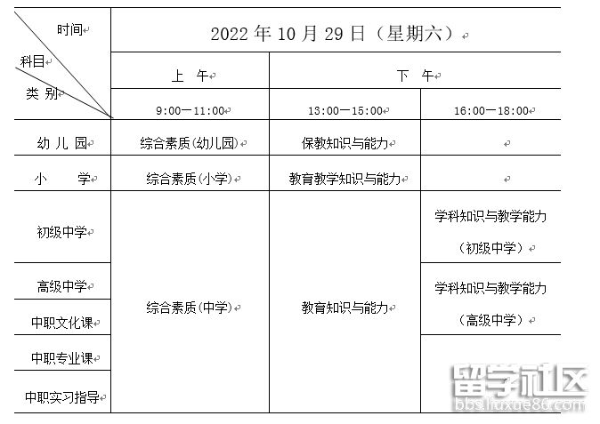 教師資格筆試安排在1天內(nèi)考完,具體考試時間和考試科目安排如下: