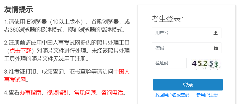 1.首次報考人員應在報名前完成用戶注冊,網上報名系統將對身份信息、學歷學位信息進行在線核查。報考人員提交注冊信息24小時后可登錄網上報名系統報名,如有未完成核驗的項目,選擇考試報名時會有相應的提示信息,須待核驗完成后方可報名。建議報考人員在報名前預留充足時間提前完成用戶注冊。