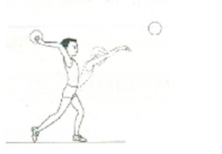 動(dòng)作方法:兩腳前后開(kāi)立,兩臂屈肘,兩手持球于頭后,重心落在后腿上,雙手持球于頭后,呈反弓;然后兩腳用力蹬地,收腹,揮臂,甩腕,將球從頭后向前上方拋出。
