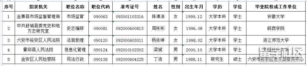附件:六安市2022年度考試錄用公務員擬錄用人員名單(四)