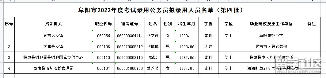 阜陽市2022年度考試錄用公務(wù)員擬錄用人員名單公示(第四批)