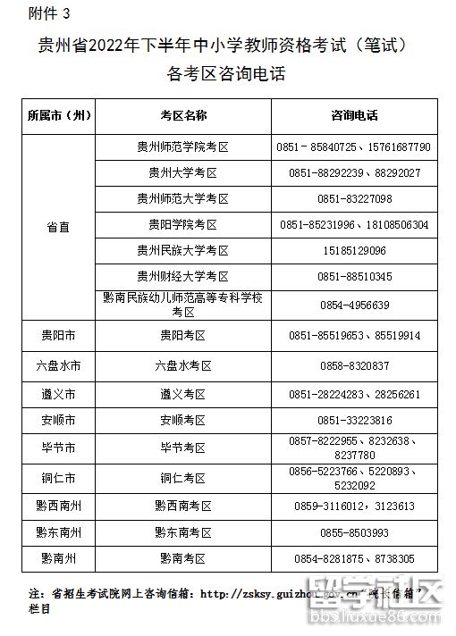 3.貴州省2022年下半年中小學(xué)教師資格考試(筆試)各考區(qū)咨詢電話.docx