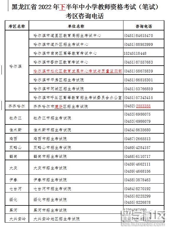 2.黑龍江省2022年下半年中小學(xué)教師資格考試(筆試)考區(qū)咨詢電話.docx