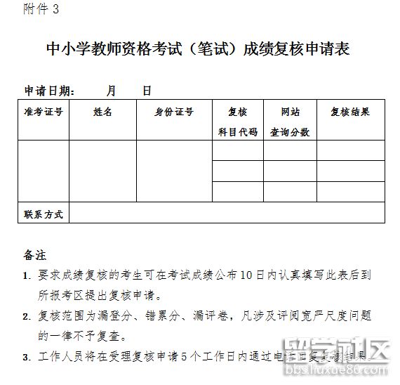 考生如對(duì)本人的考試成績(jī)有異議,可在考試成績(jī)公布10日內(nèi)向所在考區(qū)招考機(jī)構(gòu)提交《黑龍江省中小學(xué)教師資格考試(筆試)成績(jī)復(fù)核申請(qǐng)表》(附件3)提出復(fù)核申請(qǐng),復(fù)核范圍為漏登分、錯(cuò)累分、漏評(píng)卷,凡涉及評(píng)閱寬嚴(yán)尺度問題的一律不予復(fù)查。工作人員在受理復(fù)核申請(qǐng)5個(gè)工作日內(nèi)向考生回復(fù)成績(jī)復(fù)核結(jié)果。