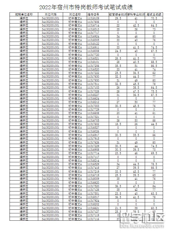 完整表格點擊:2022年宿州市特崗教師考試筆試成績.pdf